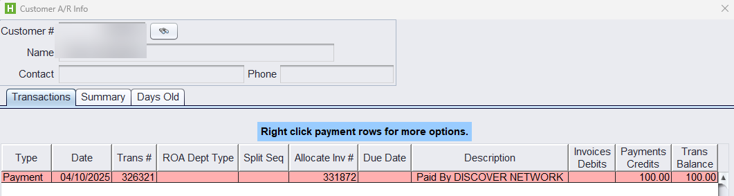 Once the ticket is finalized and closed, you will notice that the credit is reconciled accordingly on the customer’s A/R account. (Note: This cannot be allocated to an invoice)