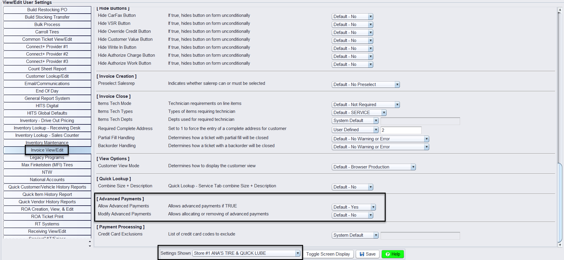 Note: This feature is enabled by default at the store level. To edit or remove permissions, please go to Views>Administration & Utilities>Store>View/Edit Default Settings and select Invoice View/Edit from the left panel and scroll down until you see Advance Payments options for each store individually under Settings Shown. Users must have P17=Y or P17=1, check Permission Switches for the appropriate setting.