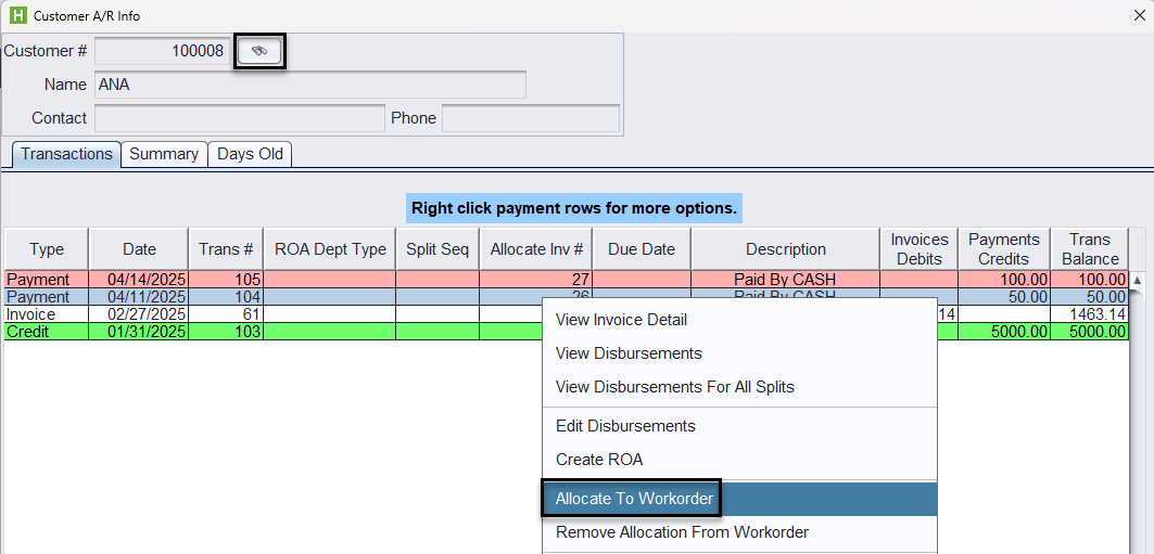 If a customer has a credit on an account you can access their A/R Info & Lookup screen, right-click on the credit, and then click Allocate To Workorder. Enter the open workorder number (Note: You can click the Copy# button from the Main tab of the workorder prior) and then click OK.
