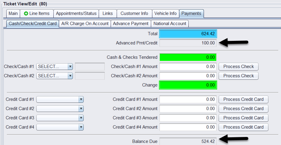 Example: A customer leaves a $100 deposit on a $624.42 Workorder. After applying the advance payment, the remaining balance shown on the Cash/Check tab becomes $549.50.