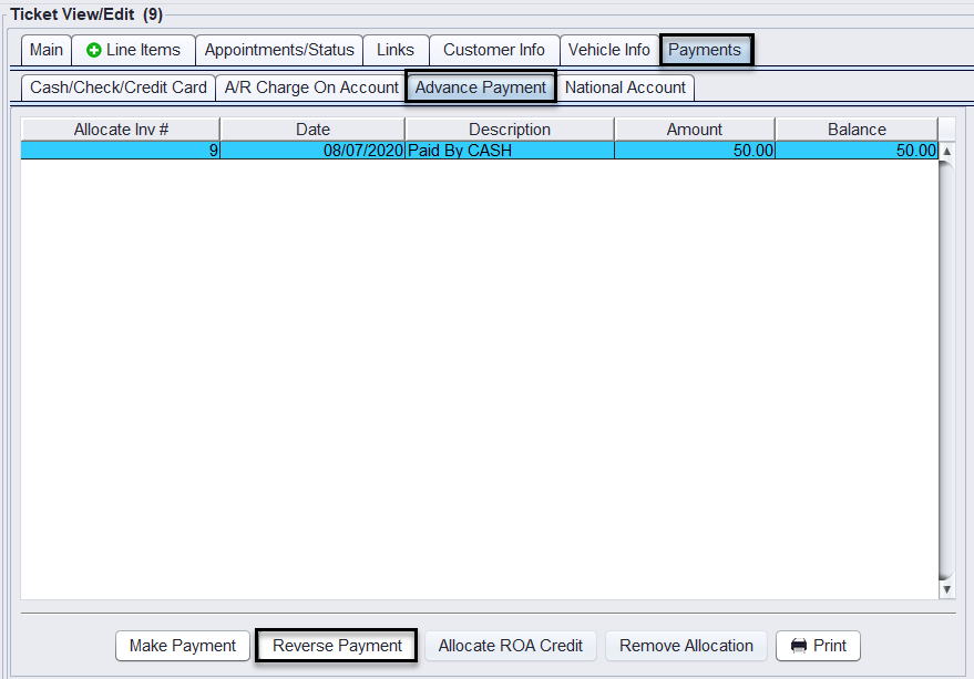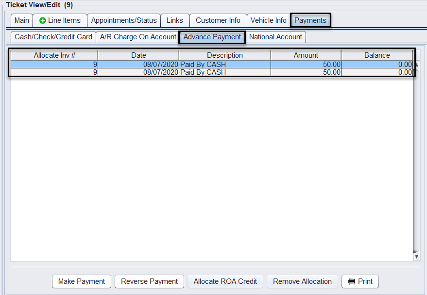 Now there will be the payment and the reversed payment recorded under Advance Payment tab on the ticket.