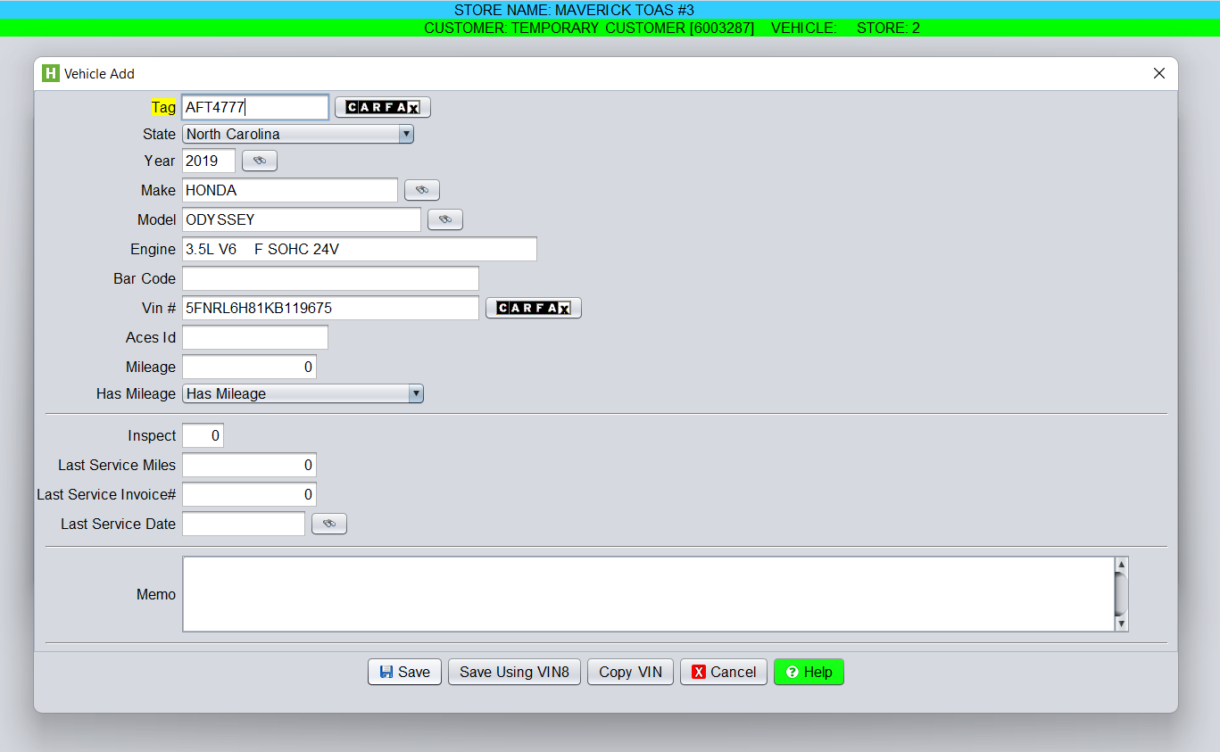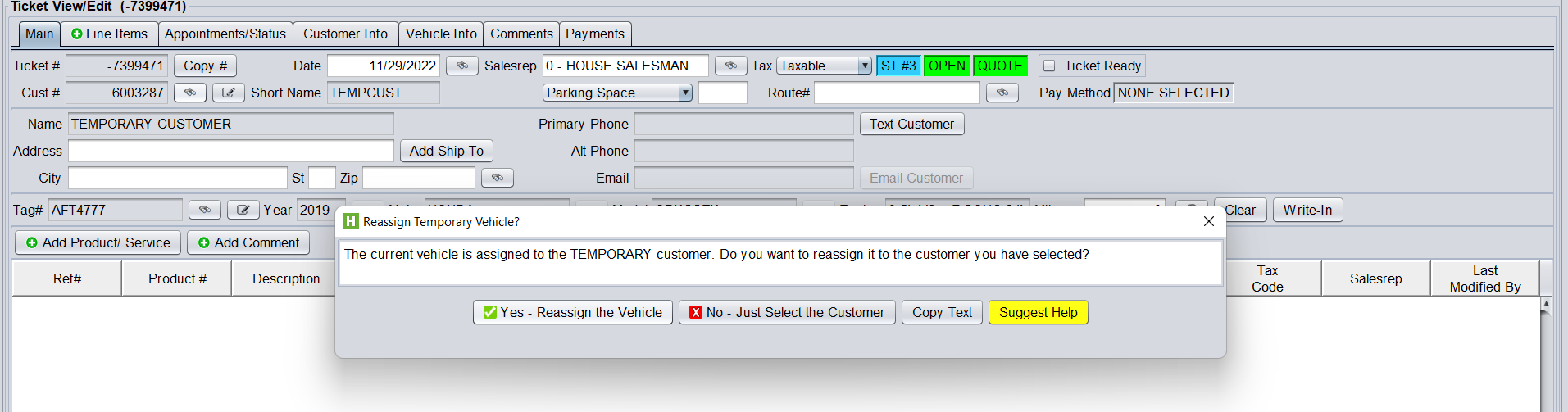 Once you gather and add the customer’s information and add it to the system, the vehicle will be assigned to the customer added. The system will not allow the closing of an invoice the Temporary Customer.