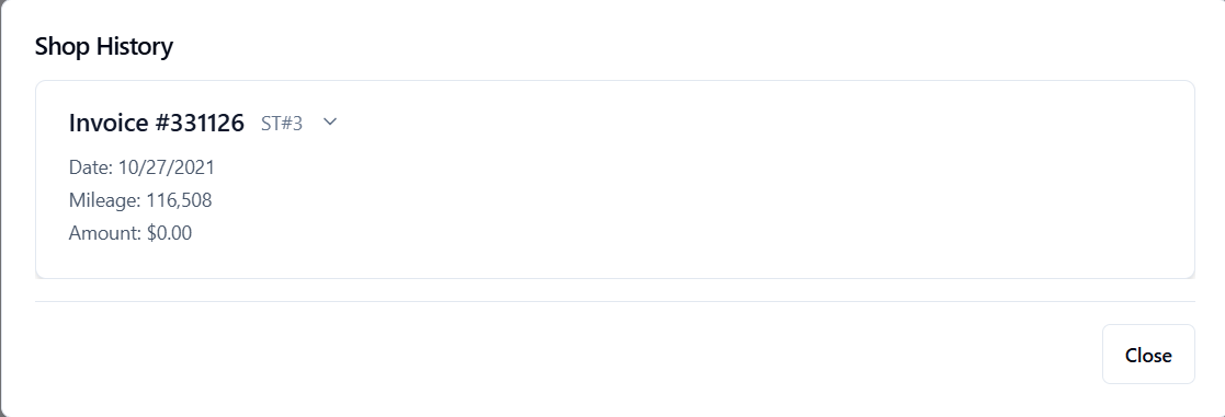 Shop History displays previous invoices for the vehicle across your locations, giving advisors quick access to past visits and service details.