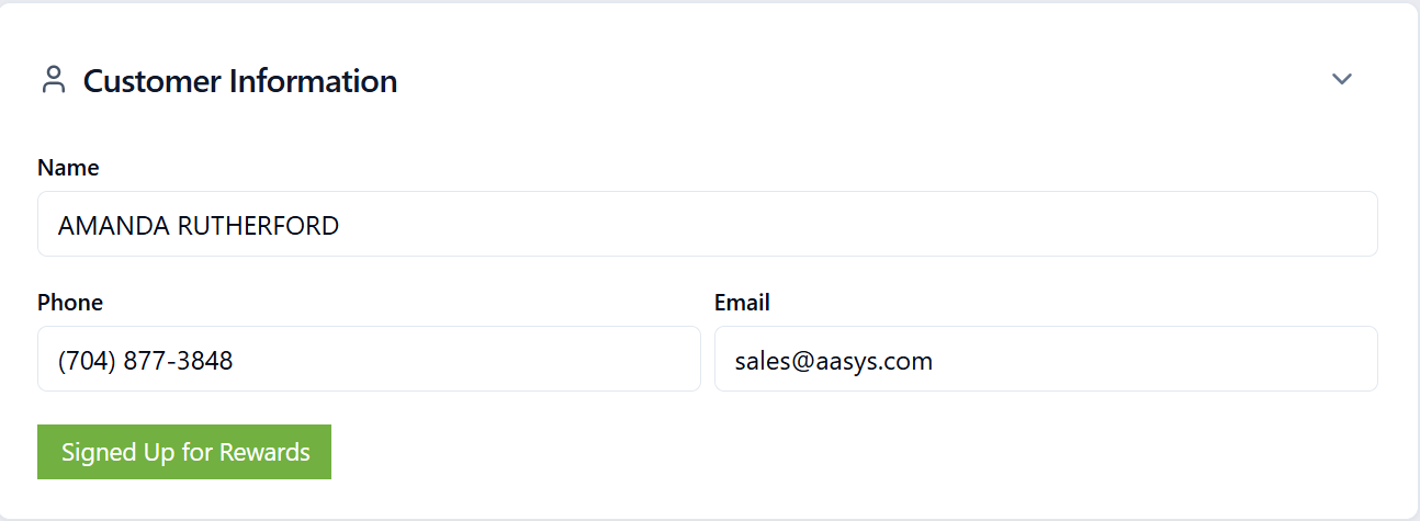 - If the customer is already enrolled, a green Signed Up for Rewards indicator appears in Customer Information.