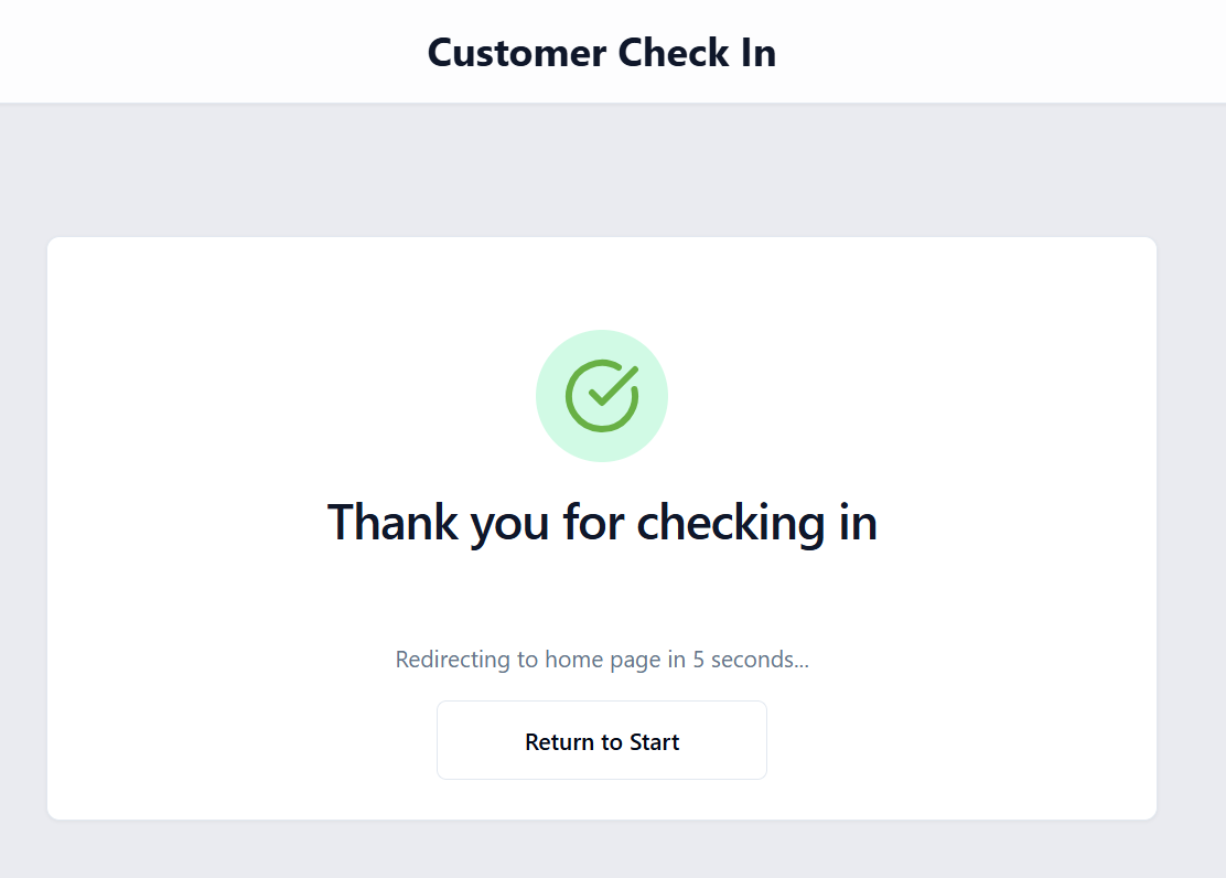 Once Check In is selected, the system displays a confirmation message and automatically returns to the start of a new check-in within approximately 8 seconds. This allows the next customer to begin the process immediately.