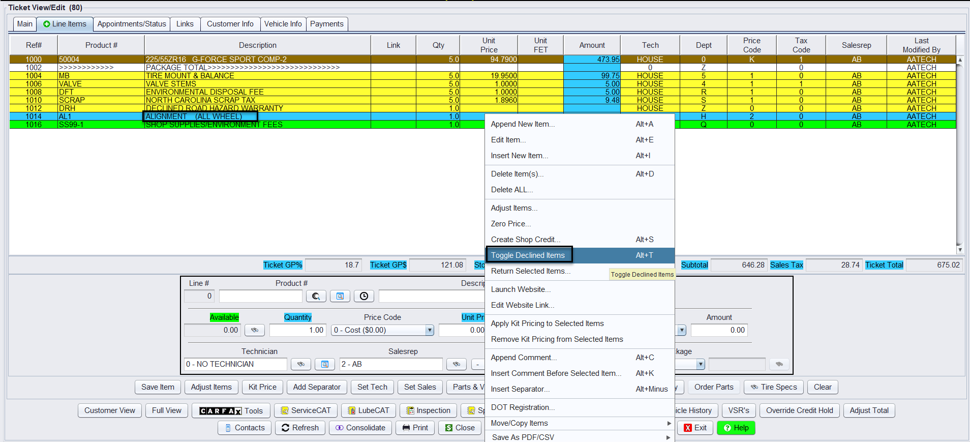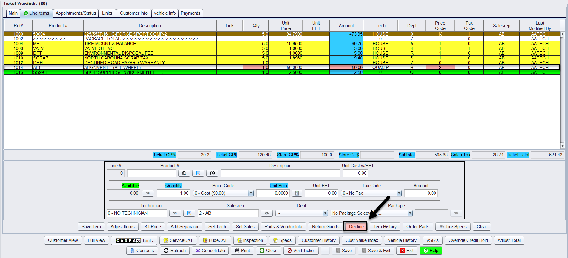 How to decline a product or service line on a ticket in HITS. Declining work allows you to document customer refusals while preserving the line item for future reference in history and reporting.