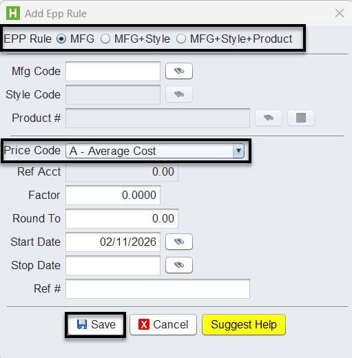 4.) Select what the EPP Rule is going by: MFG, MFG+Style, or MFG+Style+Product, then select the Price Code option from the drop-down menu.