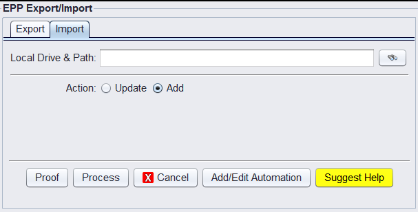 1.) Go to Views > Administration & Utilities > Data > EPP Export/Import.
