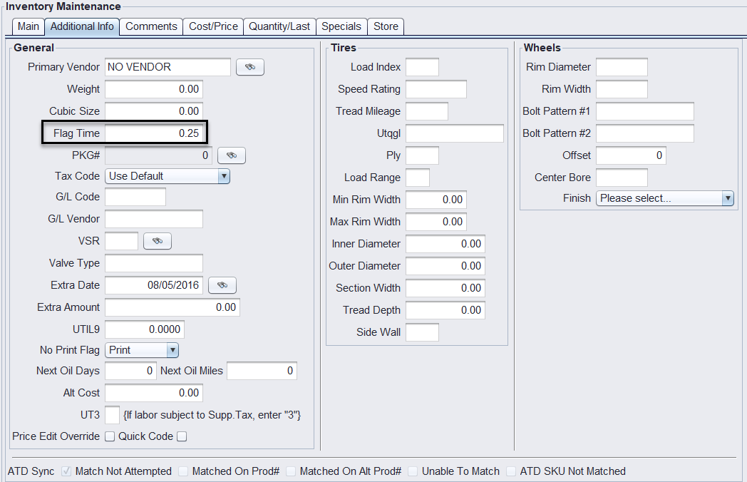 | Disposal Fees / Tire Tax | Set Flag Time = -1 to suppress from technician reports |