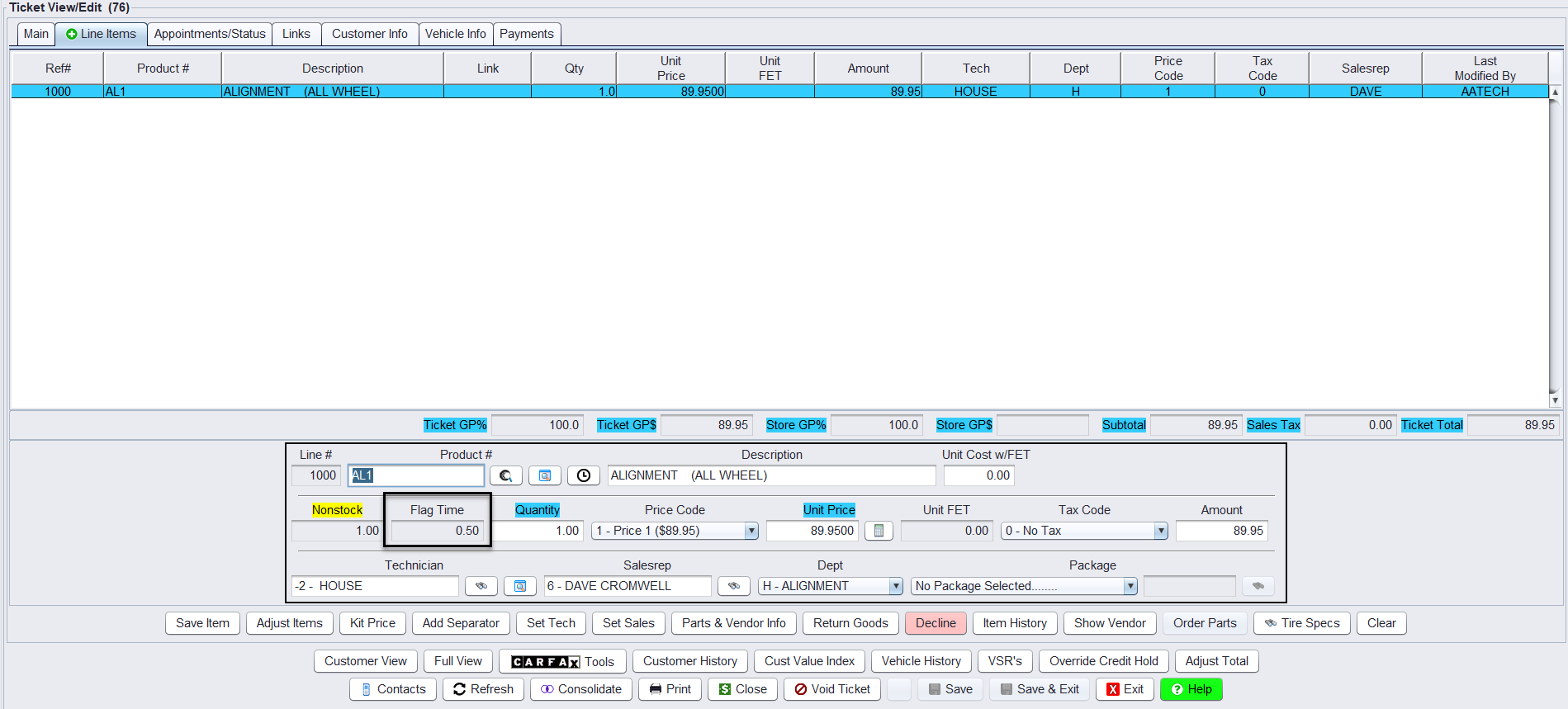 Flag time represents the credited time assigned to a technician for performing a specific job. It may differ from the actual time clocked. For example: