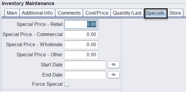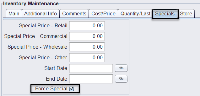 The Force Special option allows you to highlight inventory items in the inventory lookup screen without changing the selling price.
