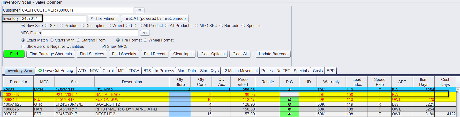 NOTE: If you enter the exact product number in the inventory lookup, the highlight will not display.