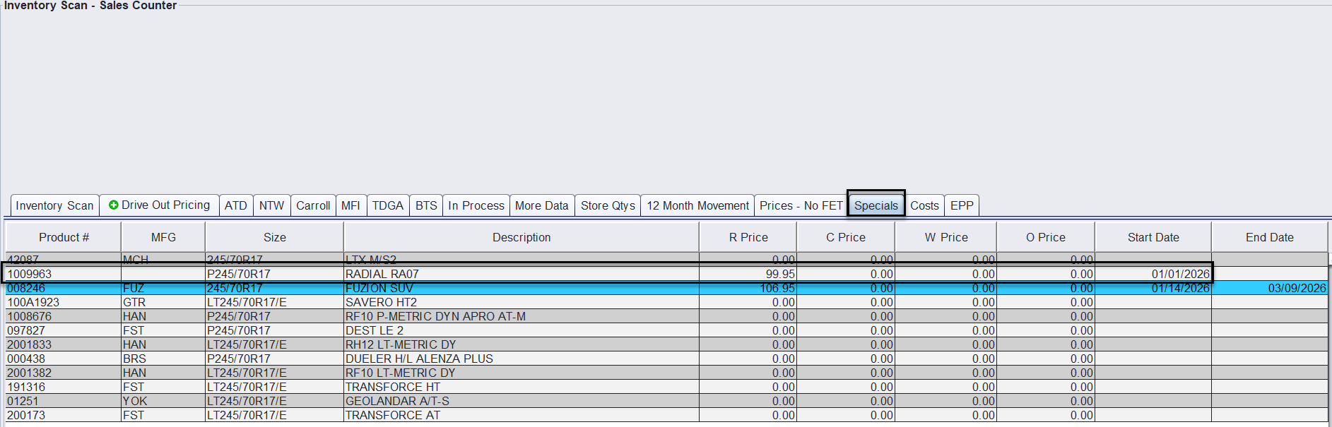 If a special price exists for an item, it can be viewed directly from the Inventory Lookup screen on the Specials tab.