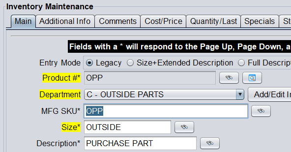 In HITS, these are often used for outside parts with product codes such as OPP (Outside Purchase Parts); OPT (Outside Purchase Tires); OPW (Outside Purchase Wheels); and OPD (Outside Purchase Dealership Parts). You can also create your own outside part codes.