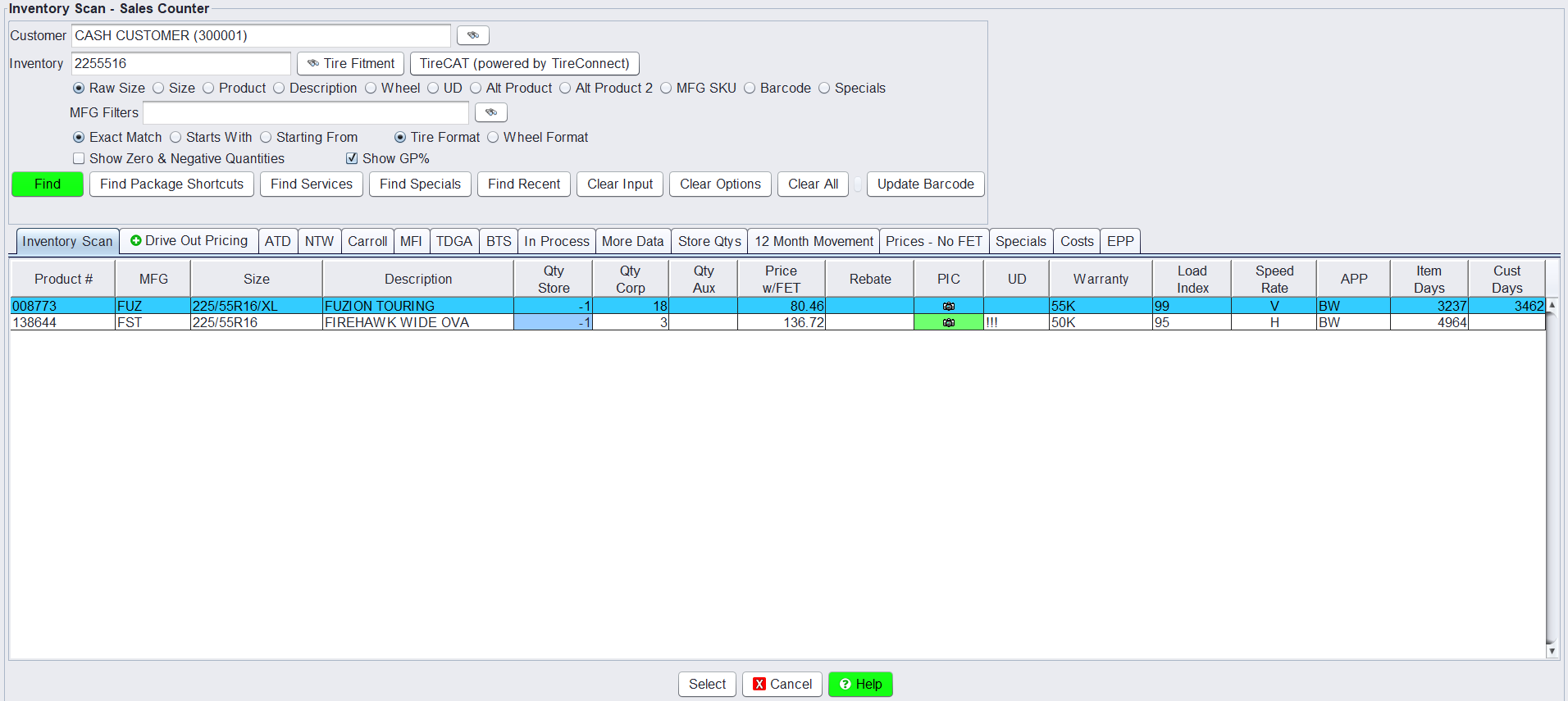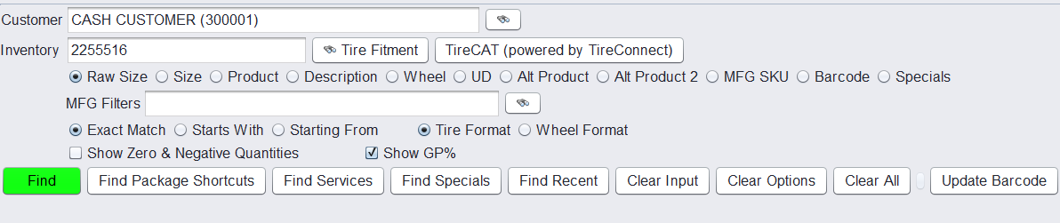 - Raw Size – Search using the raw tire size format stored in the system