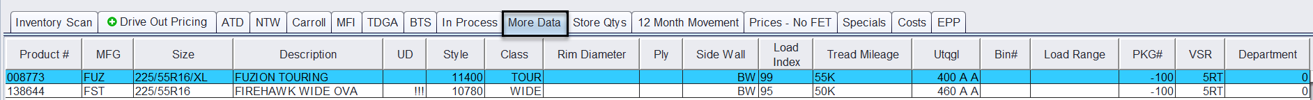 This may include information such as style, class, rim diameter, load index, tread mileage, UTQGL, bin location, department, and other product or system fields.