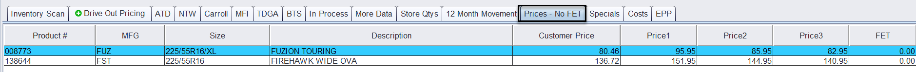 The Prices – No FET tab displays the item’s price levels without Federal Excise Tax (FET) in separate columns.