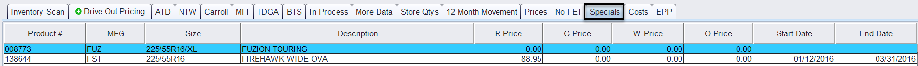 Displays any special pricing currently configured for the item, including pricing by customer type (Retail, Commercial, Wholesale, Other), and start/end dates.