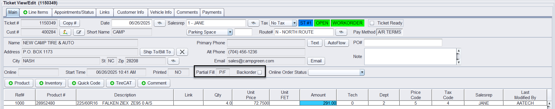 HITS includes built-in support for managing Partial Fill and Backorder Tirelink tickets that customers have submitted, allowing you to track unfulfilled customer orders and streamline allocation of incoming inventory. HITS automatically checks the available inventory and determines if the order can be fully filled. If not, the ticket is flagged as Partial Fill = Yes. Below is an example of what that looks like on a ticket:
