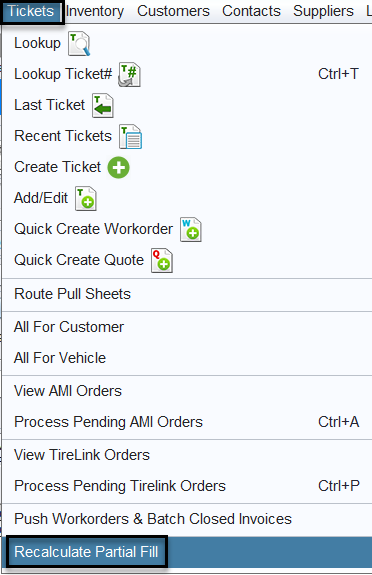 - Update any tickets flagged as Partial Fill to remove the P/F flag if they can now be fulfilled