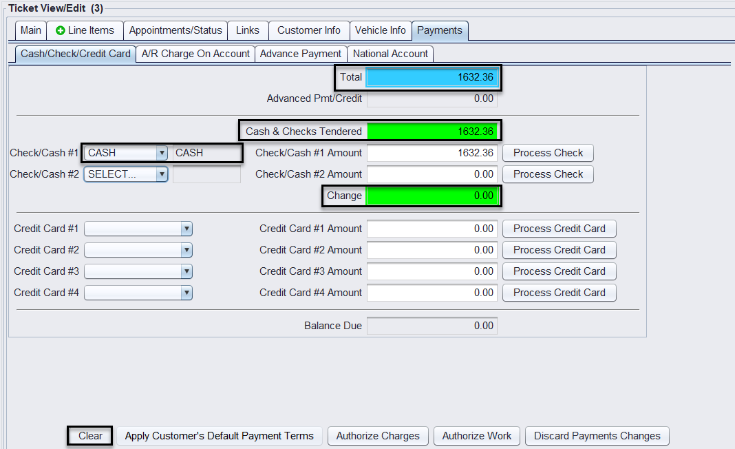 Enter each portion in the appropriate field on the Cash/Check/Credit Card or A/R Charge On Account tab. You must ensure the Balance Due = 0 before you can close the ticket.