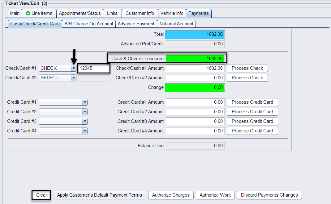 1.) In the Payments tab, stay in Cash/Check/Credit Card.