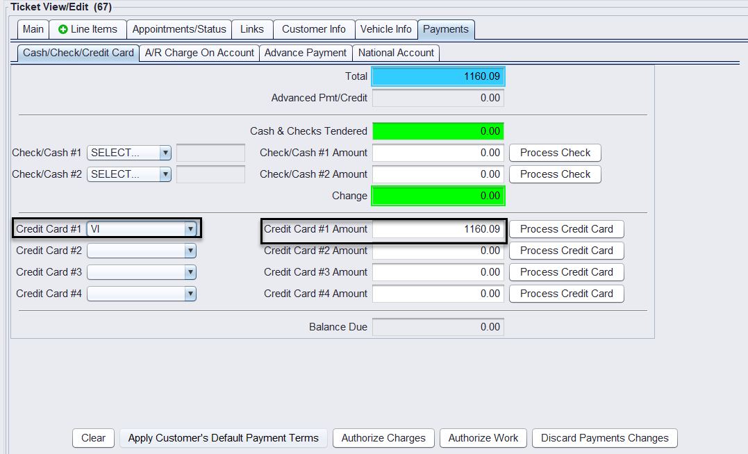 To apply an advance payment or credit to a ticket, use the Advance Payment tab. This is used when the customer has previously deposited funds.