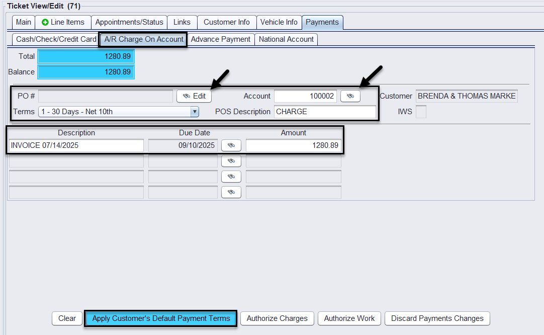 2.) When working with an Open Items customer, selecting the A/R Charge On Account tab will display their current ticket balance and allow you to apply terms.