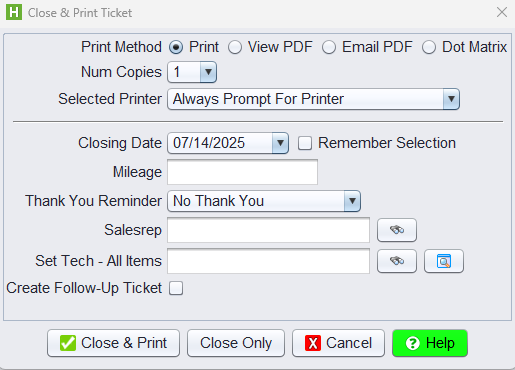- Select your Print Method (Print, View PDF, Email PDF, etc.)