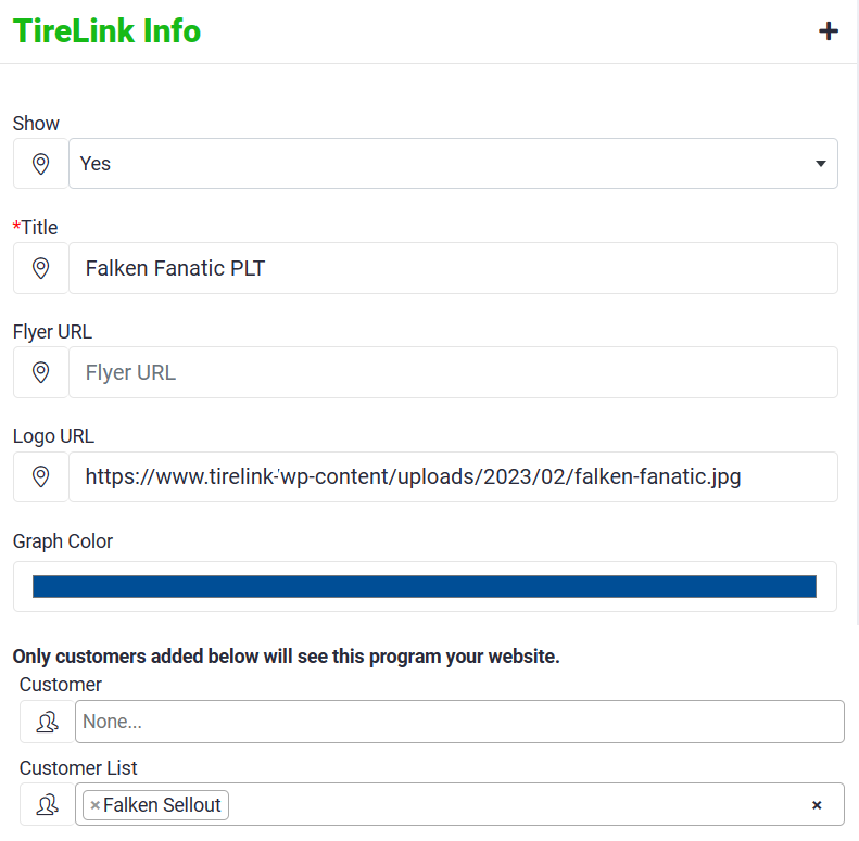 Flyer URL: On the website, there is a button call “Program Information” that will display if you have loaded a flyer URL. A flyer URL (for example) could be a PDF created by a manufacturer for their program. The flyers can be upload to your Tirelink site similar to a product image.
