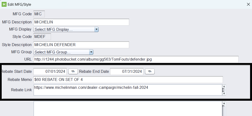You must set a Rebate Start Date and Rebate End Date for the rebate to display. You can also add a Rebate Memo to display and a Rebate Link to send the user to when they click on the icon. Click Save when done to save the Style updates. Enter your desired rebate information and click Save.