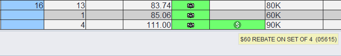 On HITS Tirelink websites, the rebate will show highlighted in green. To see the rebate information, hover over the link. To access the rebate link, click the icon.