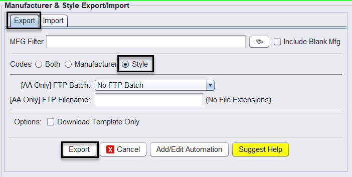 You can mass view your rebates by completing a MFG/Style Export – go to Views > Administration & Utilities > Data > MFG/Style Export/Import and go to the Export tab. Since rebates are Style record, you can just export the existing styles to see your rebates. You can utilize this feature to report on existing rebates.
