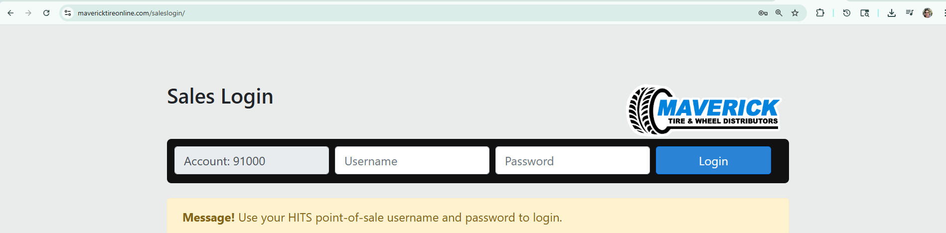 To begin, navigate to your website’s TireLink Sales Login URL, provided by HITS Technical Support.