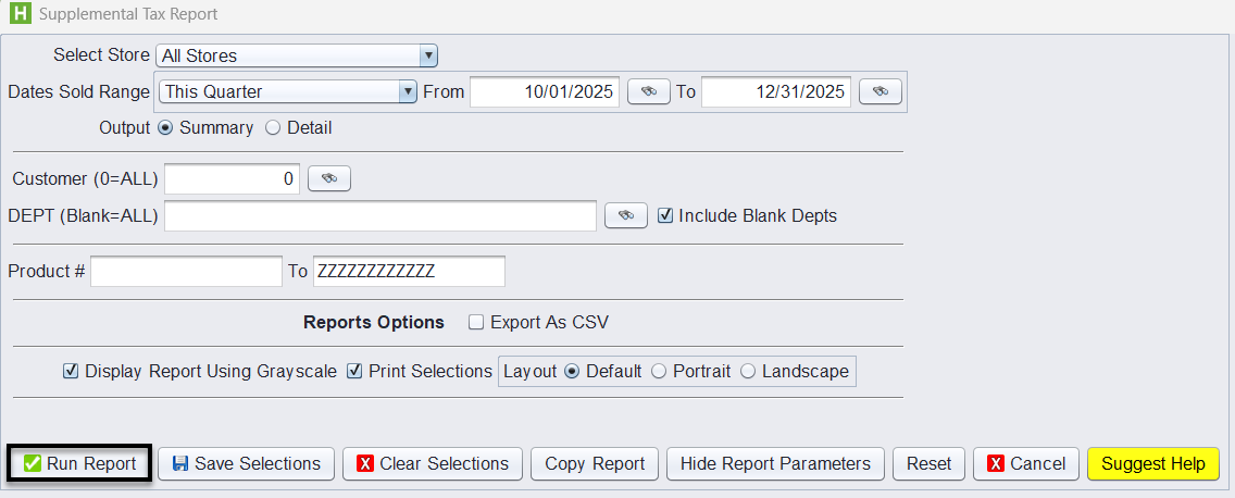 The Supplemental Tax Report is designed for stores that use Supplemental Tax Codes—an optional feature in HITS that allows you to apply additional tax layers such as city, county, or special district taxes.