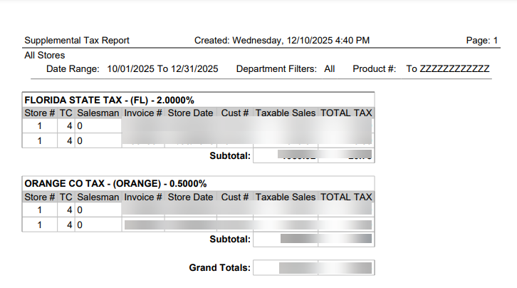 - Summary – Shows totals by supplemental tax code (Supp Tax Code), jurisdiction, taxable sales, and total supplemental tax collected.