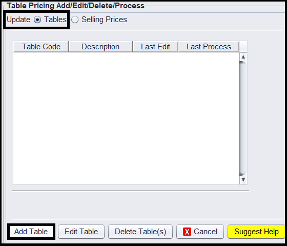 3.) Select the Update Tables radio selection and click the Add Table button to add a new Table Code