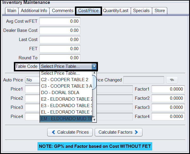 5.) On the Cost/Price tab, select the Table Code you wish to assign to this item from the drop-down menu