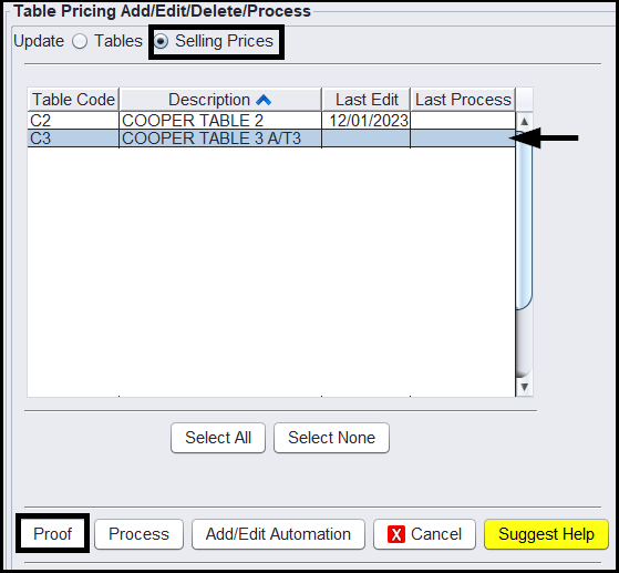 4.) Click on the Table Code you wish to Update Prices