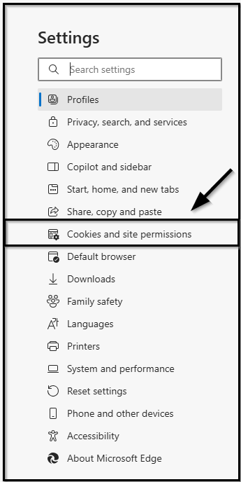 1.) In the left-hand sidebar of the Settings page, select Cookies and site permissions.