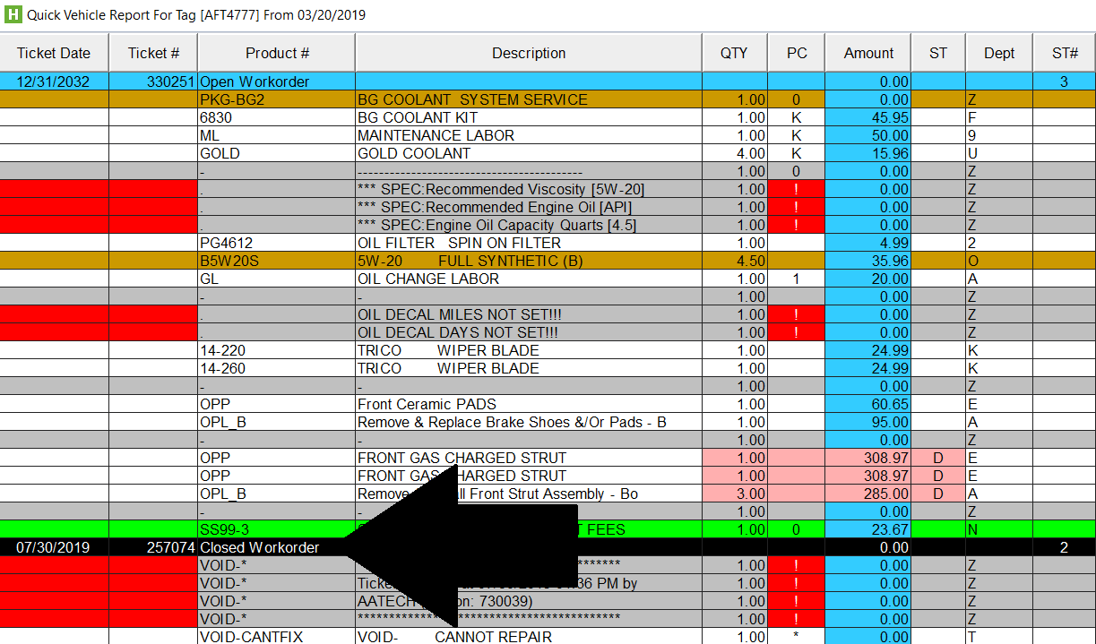 The history will display full line item item details for all previous (and future) tickets. All black rows indicate a new ticket. You can double click the black ticket row to open that ticket.