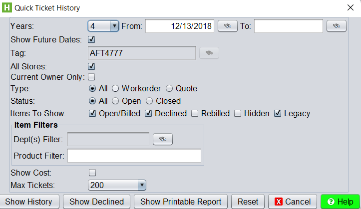 Prior to viewing the history, you will be prompted for filters such as how many years of history to view, which ticket types to include, as well as options such as including items the customer has previously declined.