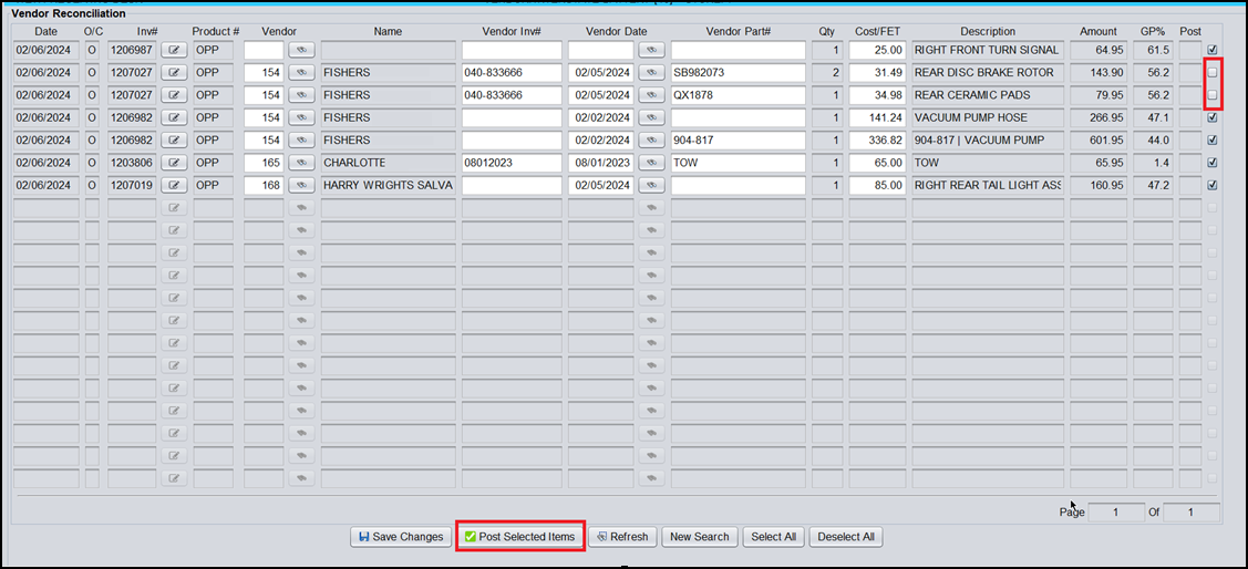 To post your vendor receipts manually, you can either post them via the Vendor Reconciliation screen all at once or via the Parts & Vendor Info button on the Ticket View/Edit screen (with password permission P72). This document covers using the Vendor Reconciliation screen for posting.